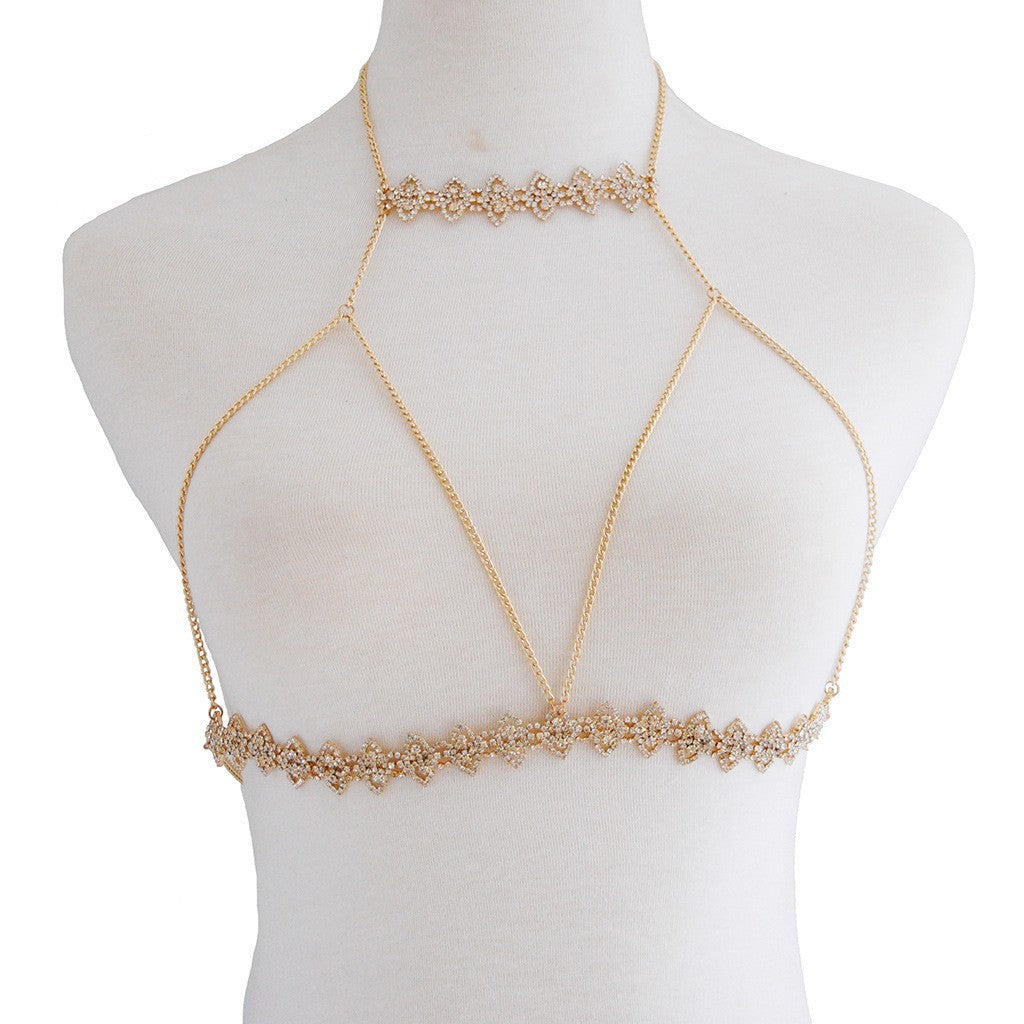 2023 European and American new cross-border original design sexy rhinestone halterneck chest chain marquise bikini beach body